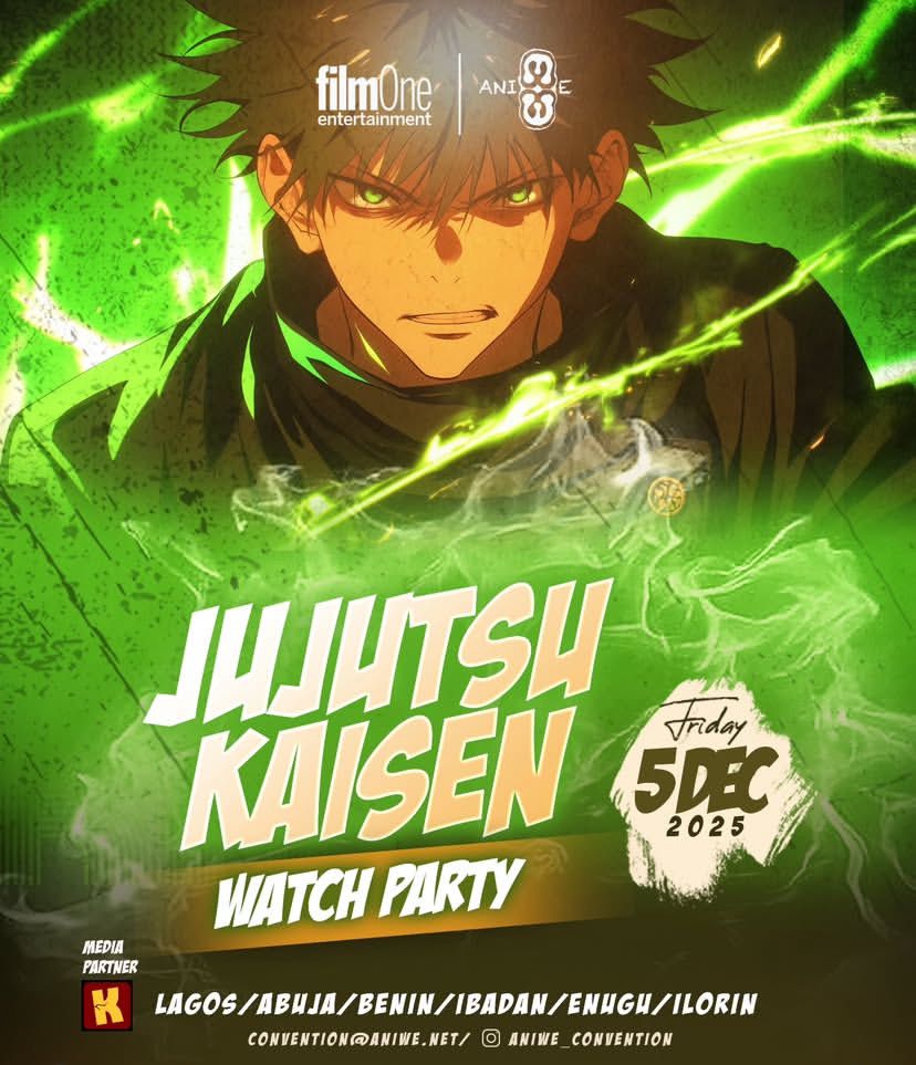 On December 5th, AniWe’s domain expansion will stretch across six major cities Lagos, Abuja, Benin, Ibadan, Enugu, and Ilorin hosting a synchronized nationwide watch party for Jujutsu Kaisen: Execution.