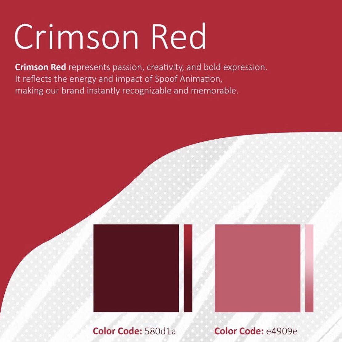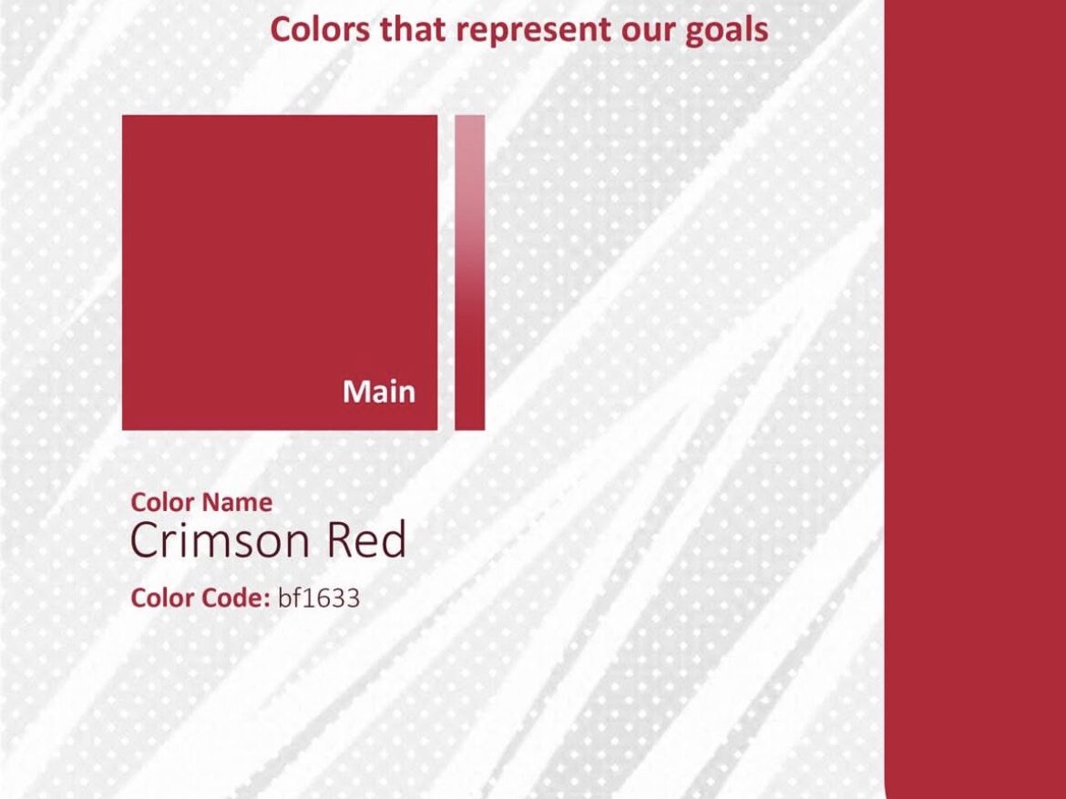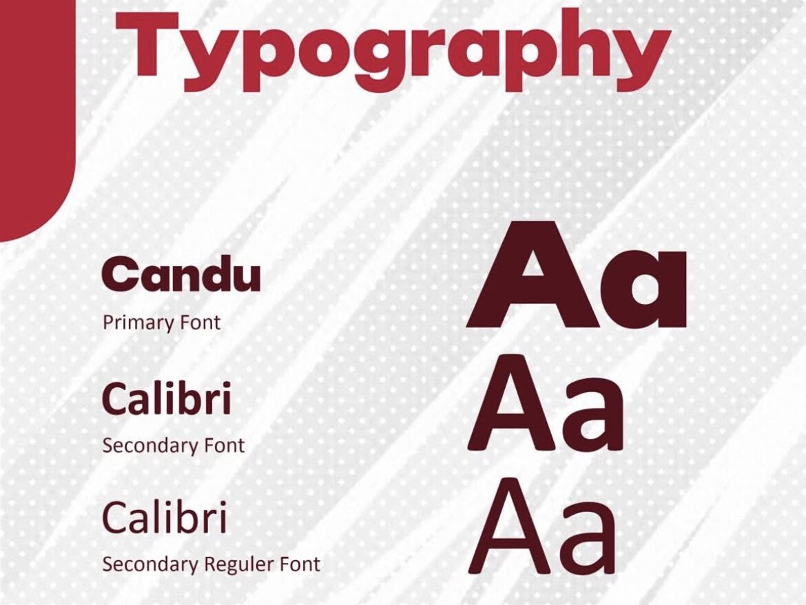 The color palette is led by Crimson Red, a bold hue representing passion, creativity, and fearless expression. Complementary tones deepen the brand’s emotional range, while typography choices like Candu and Calibri balance personality with clarity.